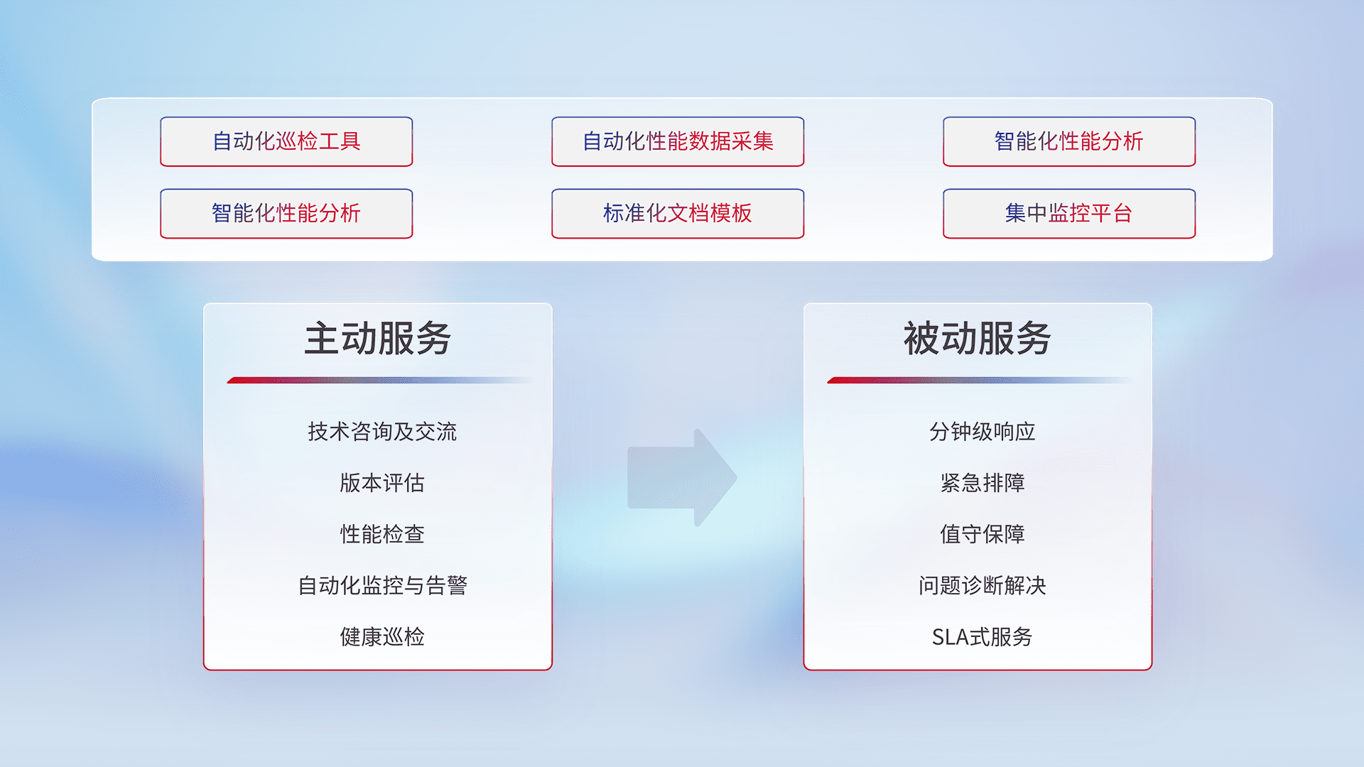 智能化工具和标准化文档,,,保障服务质量,,提供主动服务(包含技术咨询、、、版本评估、、性能检查、、自动化监控与告警、、、健康巡检)和被动服务包含(分钟级响应、、、、紧急排障、、值守保障、、、问题诊断解决、、、SLA服务)。。。。